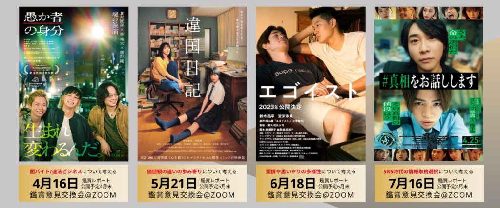 毎月1作、Netflix、もしくは、amazon PrimeVideo に登録されている課題作品を視聴したメンバーが、第三木曜日の20時~22時にオンラインで集まり、各々の感じた感想や、作品から広げられるトークテーマを模索し、親御さんや教育関係者さんが、子どもたちと一緒に作品を鑑賞する時の注意点や、メッセージ性の掘り下げに活かせてもらいやすい様、鑑賞レポートにまとめて本メディアで紹介していきます!